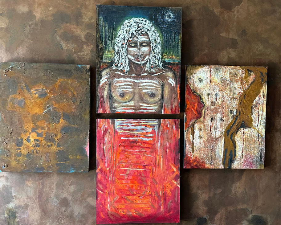 Indigenous Woman Warrior is a quadtypch which honours the strength and spirit of the indigenious woman. Painted with ceremonial markings, she stands ground in the red earth of Australia - risilient, powerful and connected to ancestral memory. Surrounding textures evoke earth, fire and story of ancient cave markings, reflecting a legacy of courage and cultural pride.